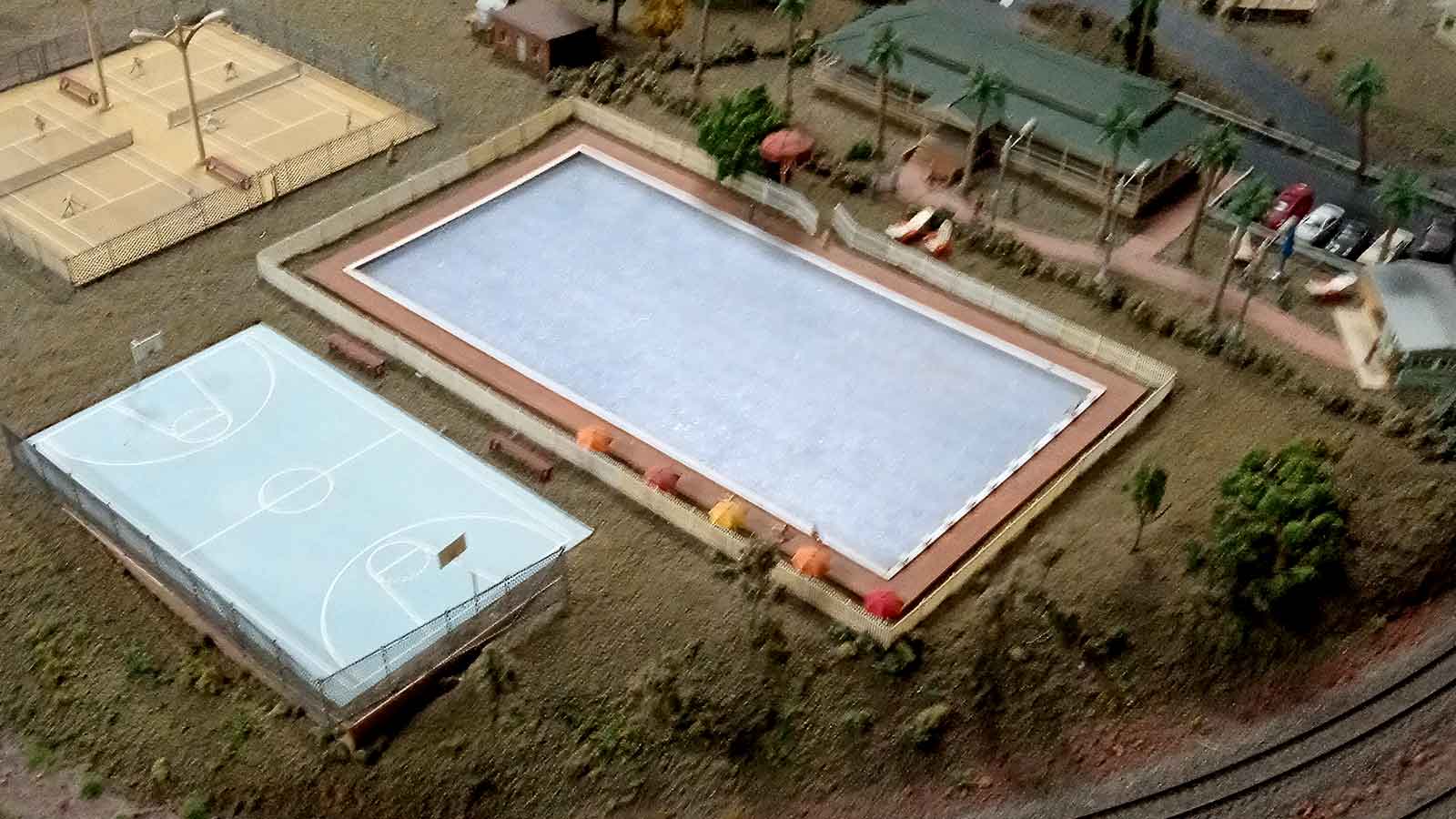 The visiting circus is still in town—listen for the music drifting from the Big Top. The sporting complex, catering for tennis, swimming, and basketball, has been upgraded, adding to the activity within the scene. A fully DCC-controlled industrial area has also been developed, supporting the existing wheat loading silos and light industries with regular rail services. Points in this precinct are operated by slow-motion servos, all controlled directly from DCC throttles.